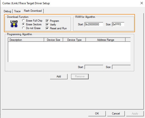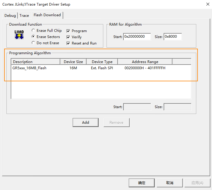 图 23 选择Download Function - 点击Add按钮,在Programming Algorithm中添加SDK_Folder\build\keil\GR5xxx_16MB_Flash.FLM。
