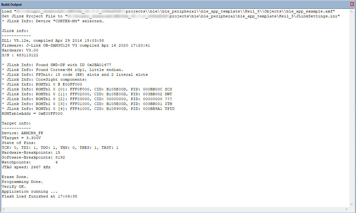 将ble_app_example.axf文件下载至芯片Flash中。如果固件下载成功,Keil的Build Output窗口将显示如下结果。