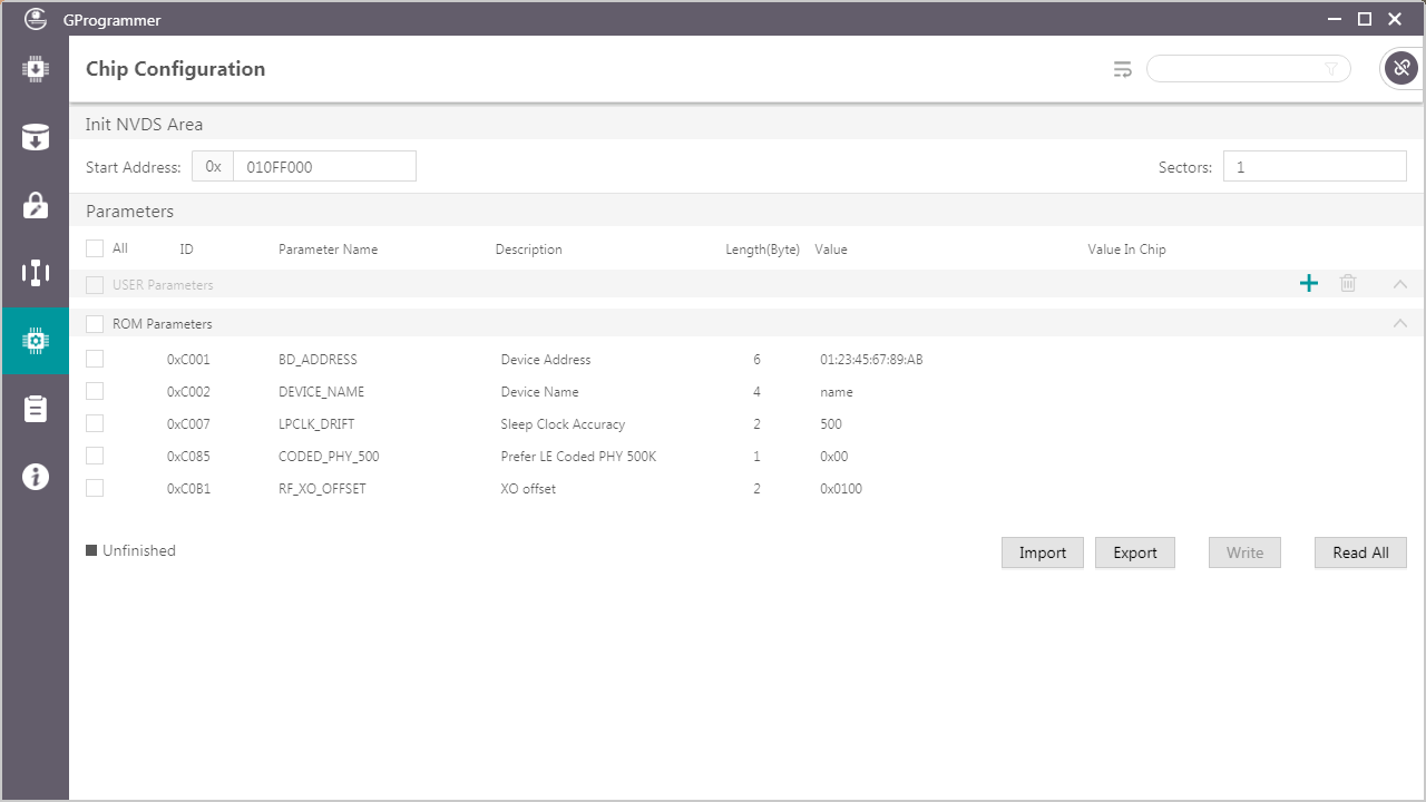 用户可配置存储在芯片NVDS区域的参数,包括USER参数和ROM参数。