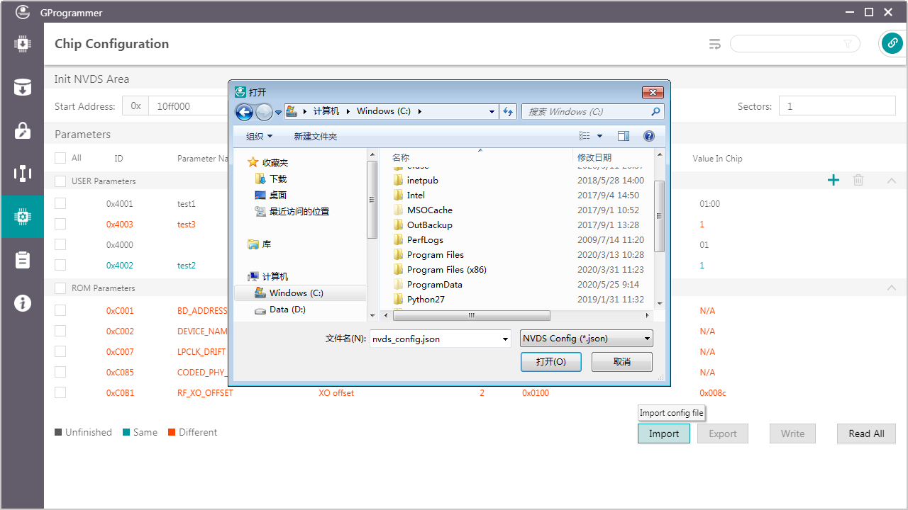 GProgrammer支持将参数列表中的所有数据(参数名称、描述、长度及值)导出为json格式的配置文件,以及从本地导入配置文件加载到列表显示。