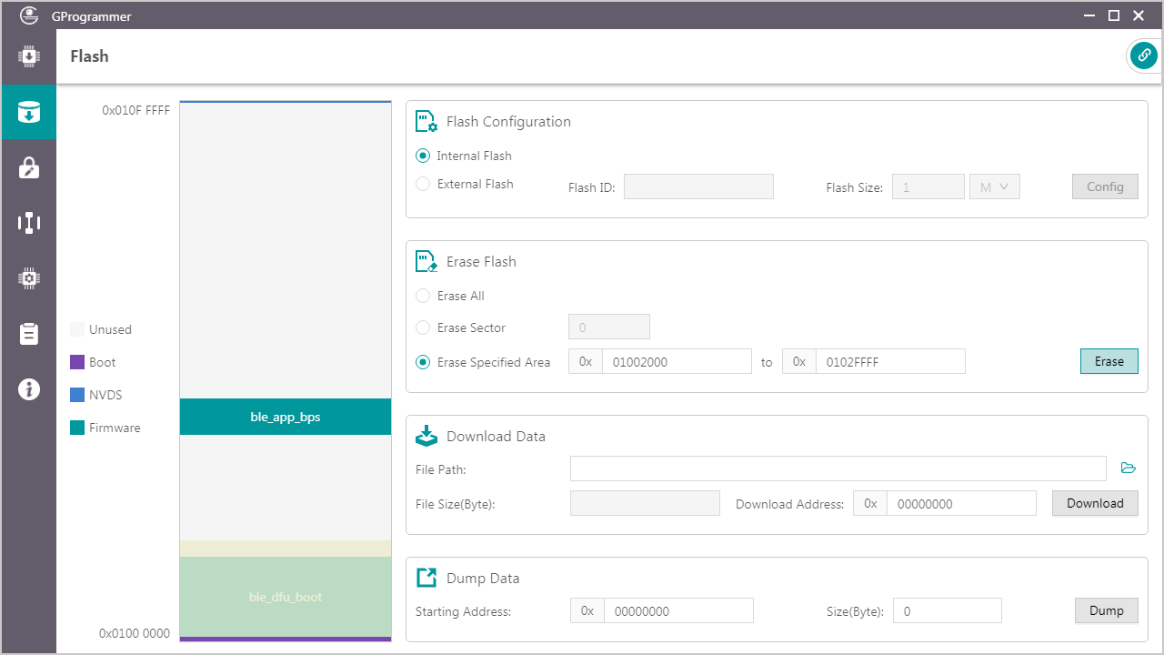 用户可对GR551x内部Flash和外部Flash进行操作,包括擦除Flash、下载数据至Flash、从Flash中Dump数据。
