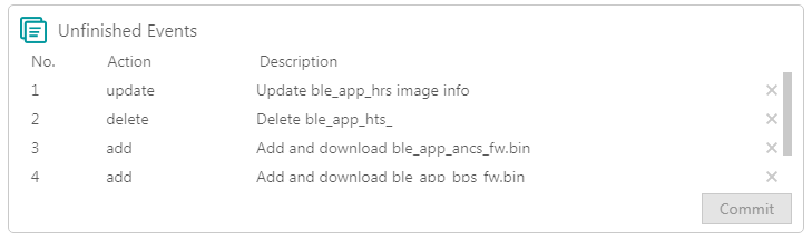 用户可一次性执行多个操作,例如:一次性下载多个固件,并将某个固件设置为启动项。用户执行的操作均为预操作,需点击Commit按钮后才会真正地执行,并且操作序列将在Unfinished Events栏中显示,如图 13所示。