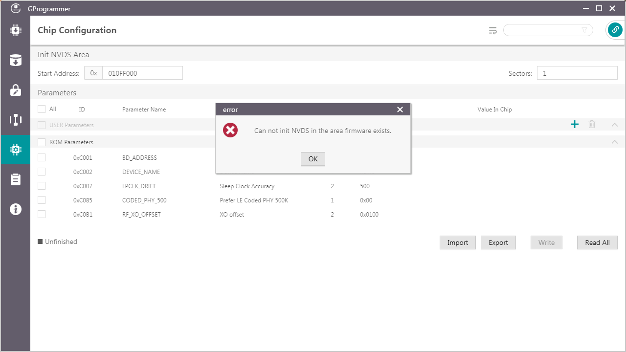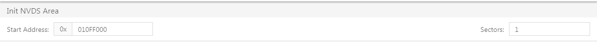 初始化NVDS 配置NVDS参数之前,用户需指定NVDS区域的起始地址(以4 KB大小对齐)和占用的Sector数量。 图 37 设置NVDS起始地址 若配置的NVDS区域与已存在的Firmware区域重叠,将无法完成NVDS初始化。 图 38 NVDS区域与固件区域重叠
