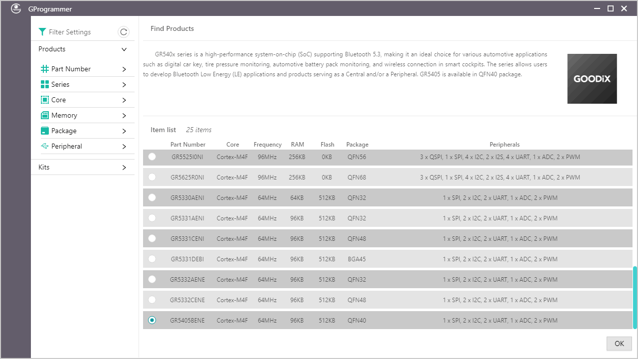在芯片选型页面,左侧为筛选条件的设置面板;右侧为筛选结果的展示面板。用户可按照产品型号、产品系列、内核、内存大小、集成的外设、封装形式等条件进行产品筛选。