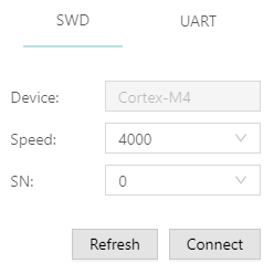 表 6 参数配置说明 参数 描述 Device 目标板的芯片内核,默认为Cortex-M4,且不可更改。 Speed 传输速率,默认为4000 kHz。 SN 目标板序列号,默认为0。 - 当PC仅连接了一个目标板时,可直接使用默认值,或点击Refresh按钮获取当前目标板序列号。
