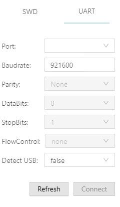 在串口(UART)连接方式下,用户可根据实际情况配置串口号Port(需点击Refresh按钮获取串口号列表,再选择正确的串口号)和波特率,其他参数默认配置不可修改。