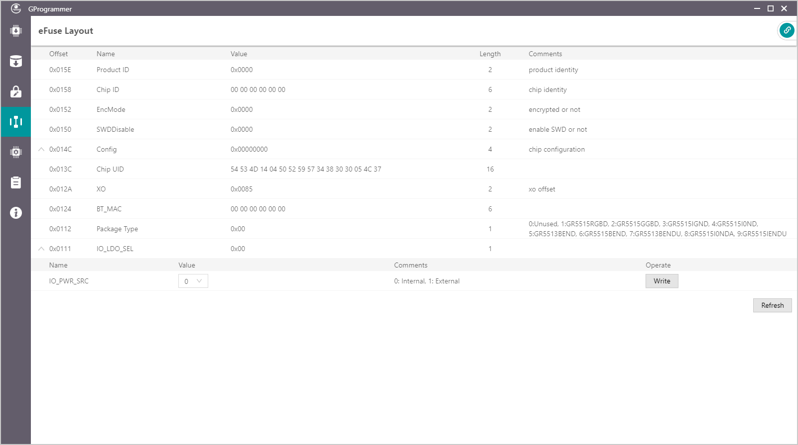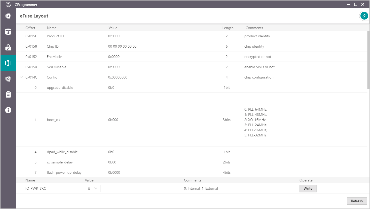 用户可查看eFuse的存储布局信息,如:产品唯一标识符(Product ID)、芯片唯一标识符(Chip ID)、安全模式(EncMode)、SWD接口(SWDDisable)、配置信息(Config)字段的偏移地址、值、长度等信息。其中,Config和IO_LDO_SEL字段还包含多个位域。