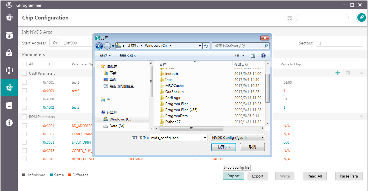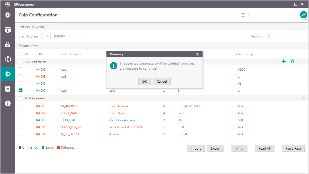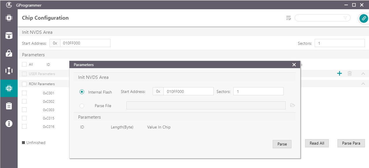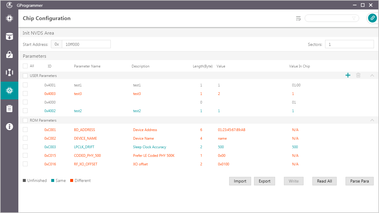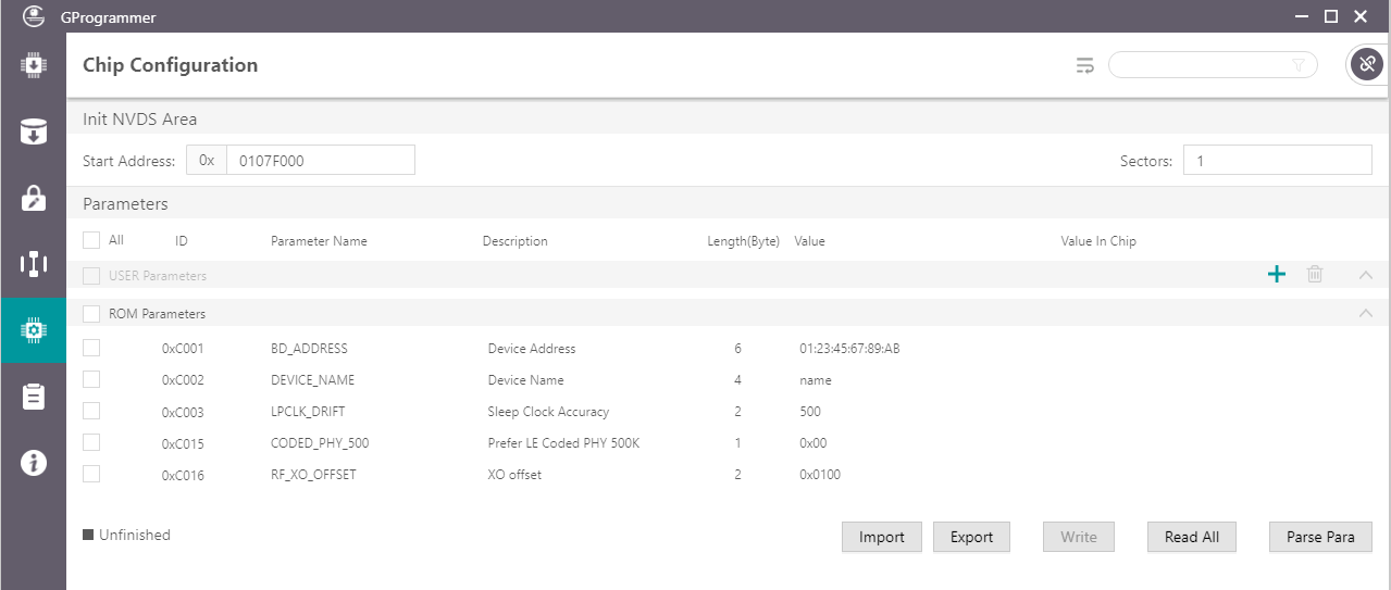 GProgrammer支持一次性读取当前芯片NVDS中的所有参数,并将读取的参数信息在“Parameters”列表中展示。