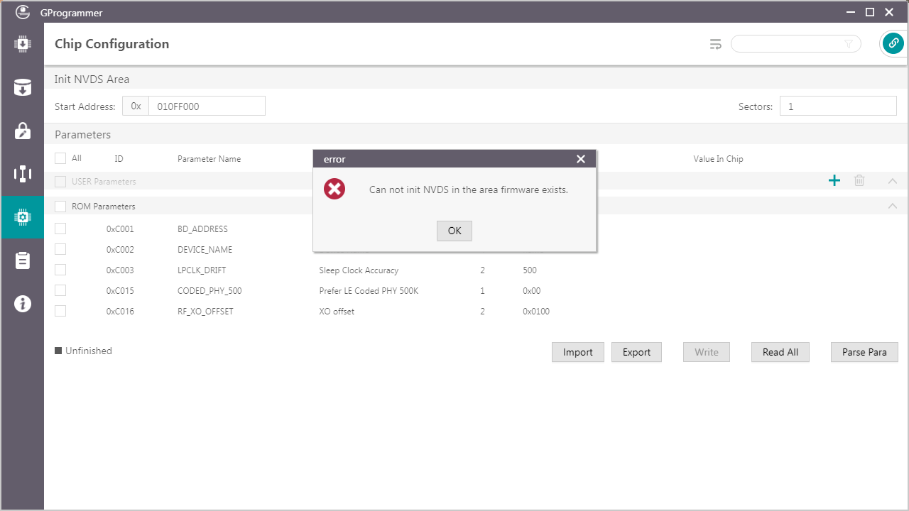 - 如果NVDS中有相同ID的参数,但参数长度不同,新增的参数值不会被写入NVDS,且参数状态显示为Unfinished。需修改参数长度,才能写入NVDS。