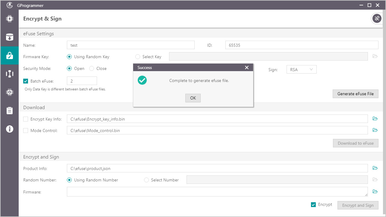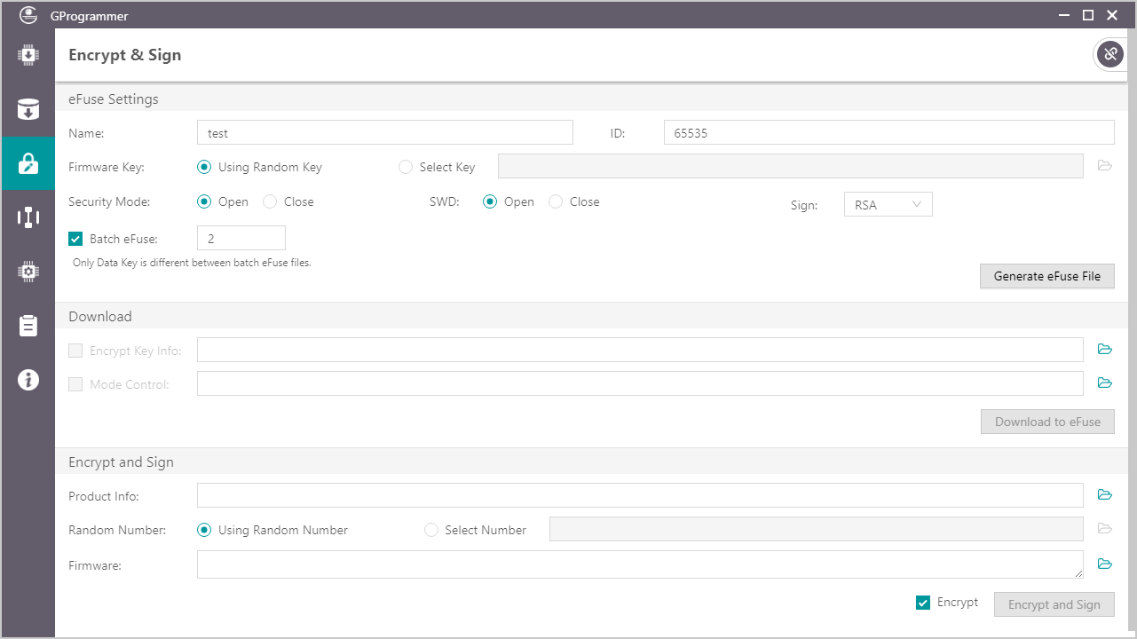 GProgrammer可对固件(.hex/.bin格式)进行加密加签或者仅加签的操作,允许用户使用同一套产品信息和同一个Random Number操作一个或者多个固件文件。