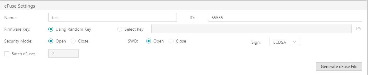 用户可通过指定产品的Name、ID、Firmware Key、Security Mode和SWD接口生成存储在eFuse中的相关文件。