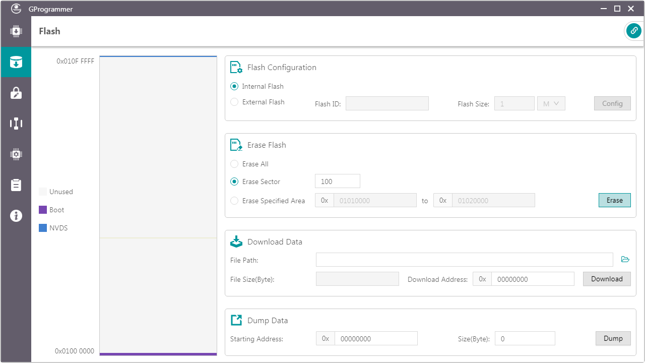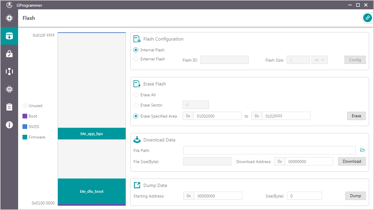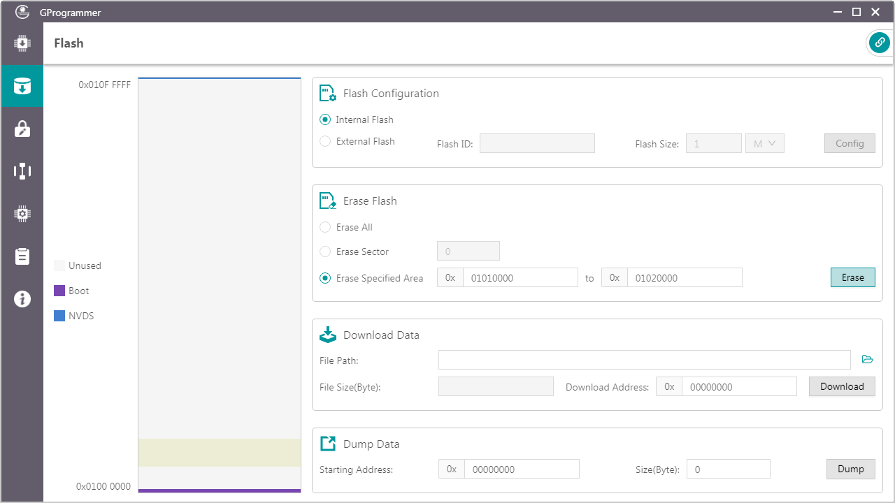 用户可对芯片内部Flash和外部Flash进行操作,包括擦除Flash、下载数据至Flash、从Flash中Dump数据。