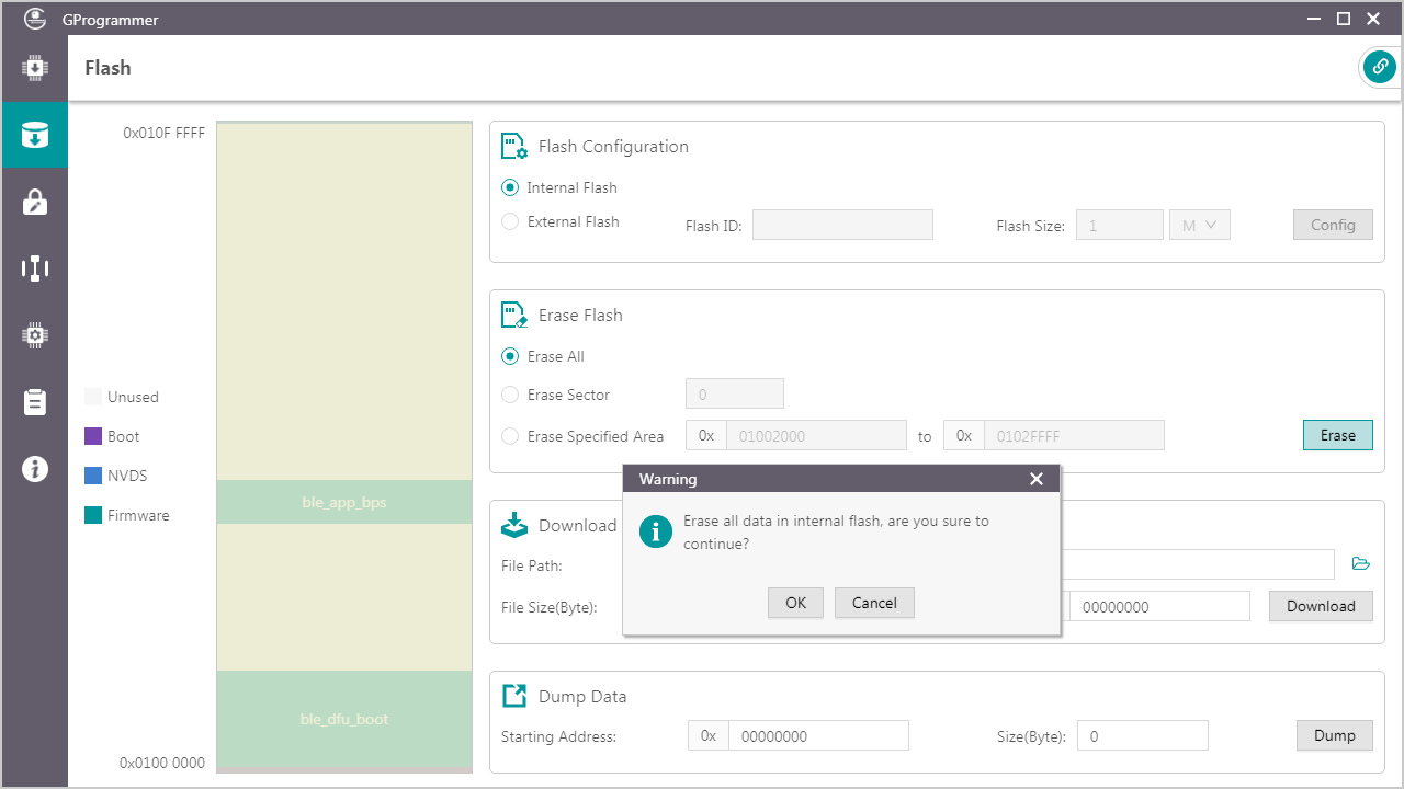 擦除后,内部Flash中的Boot和NVDS区域内容将被清空,所有Firmware将被删除。