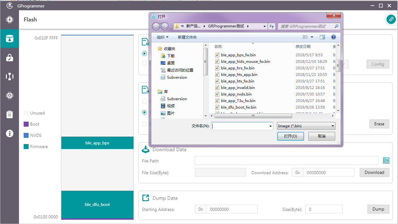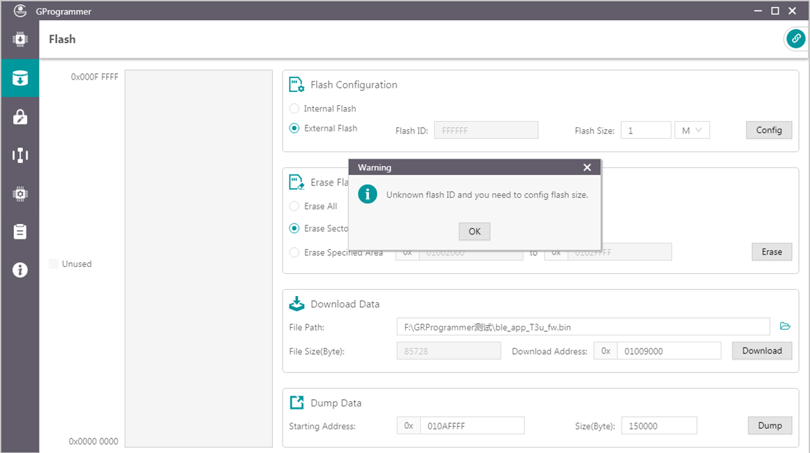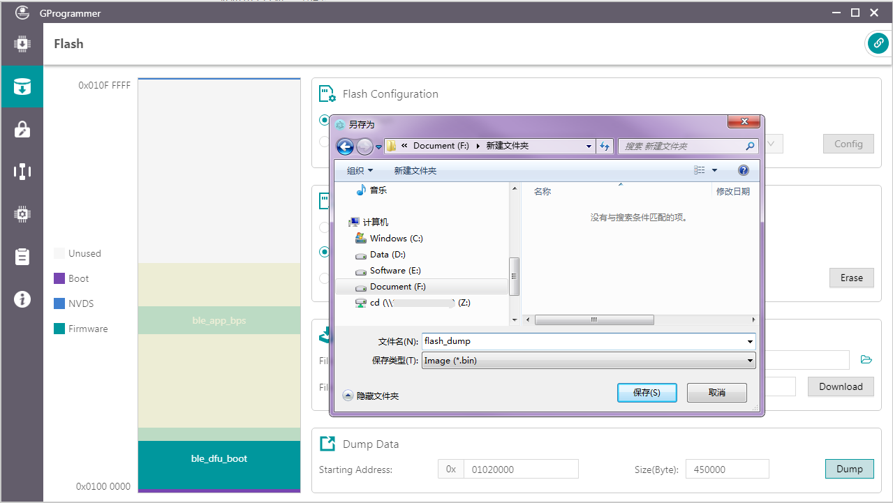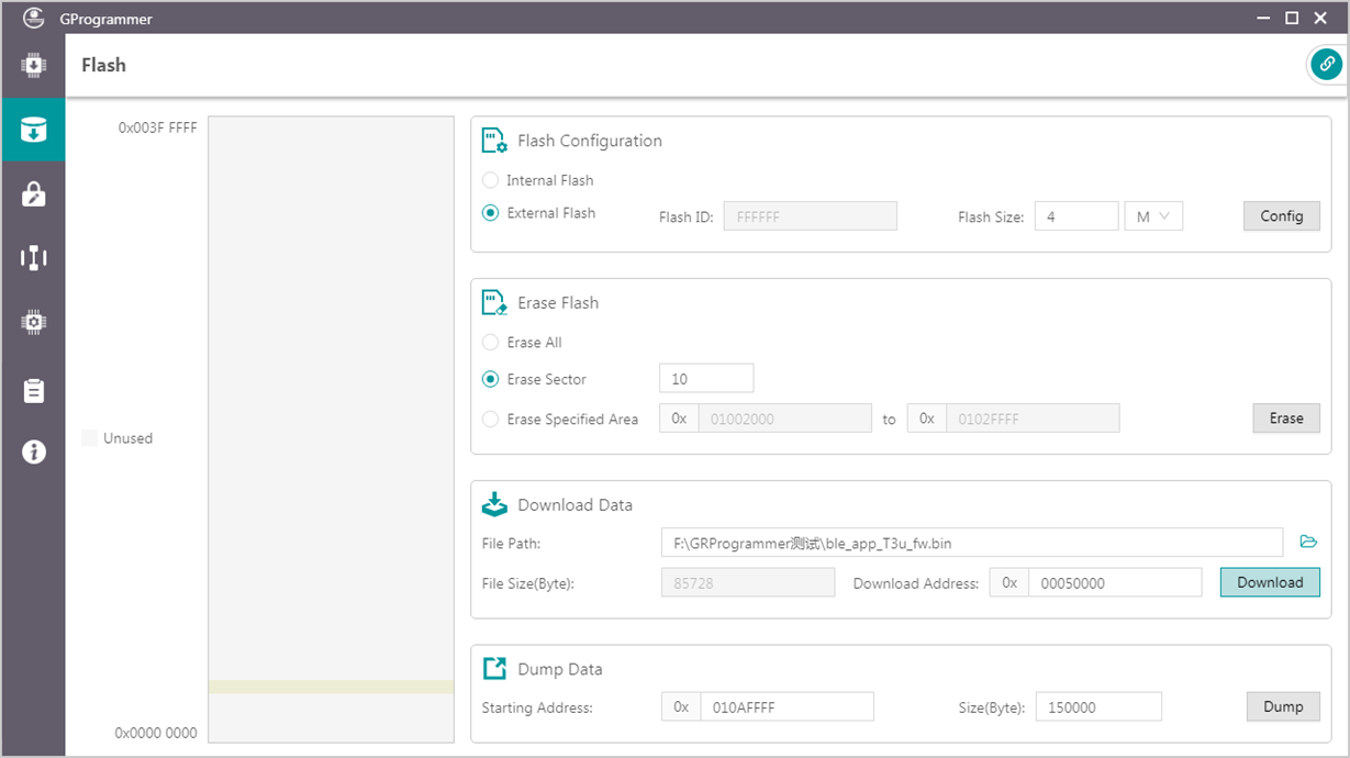 用户可通过指定起始地址和数据大小,将Flash中的任意数据Dump到本地保存为文件。