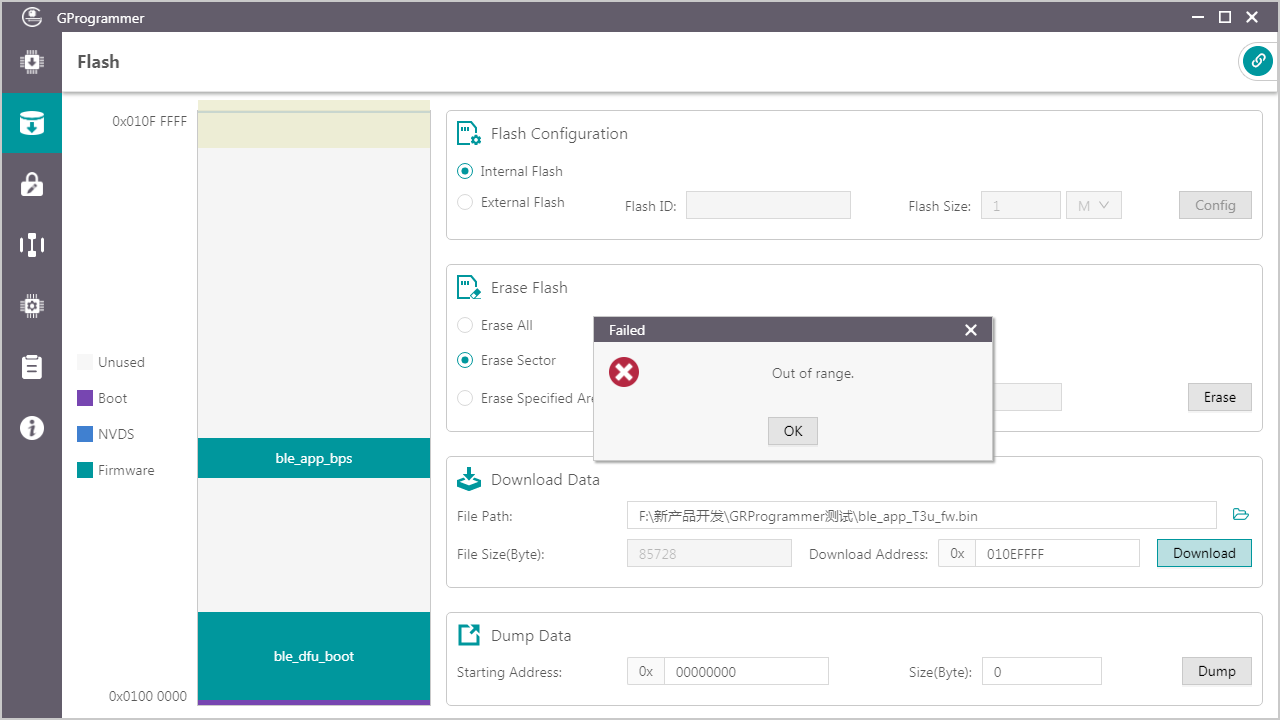 当下载的数据文件过大或设置的下载起始地址超出范围时,将导致Flash溢出报错。