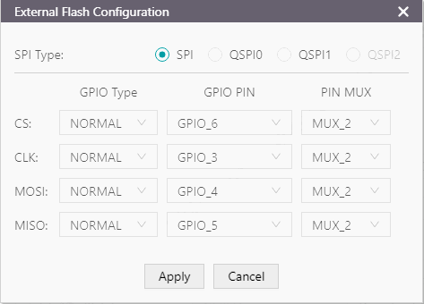 - 点击Apply按钮之前,必须确保外部Flash按照引脚配置与目标板正确连接。否则,外部Flash无法与目标板正常通信。