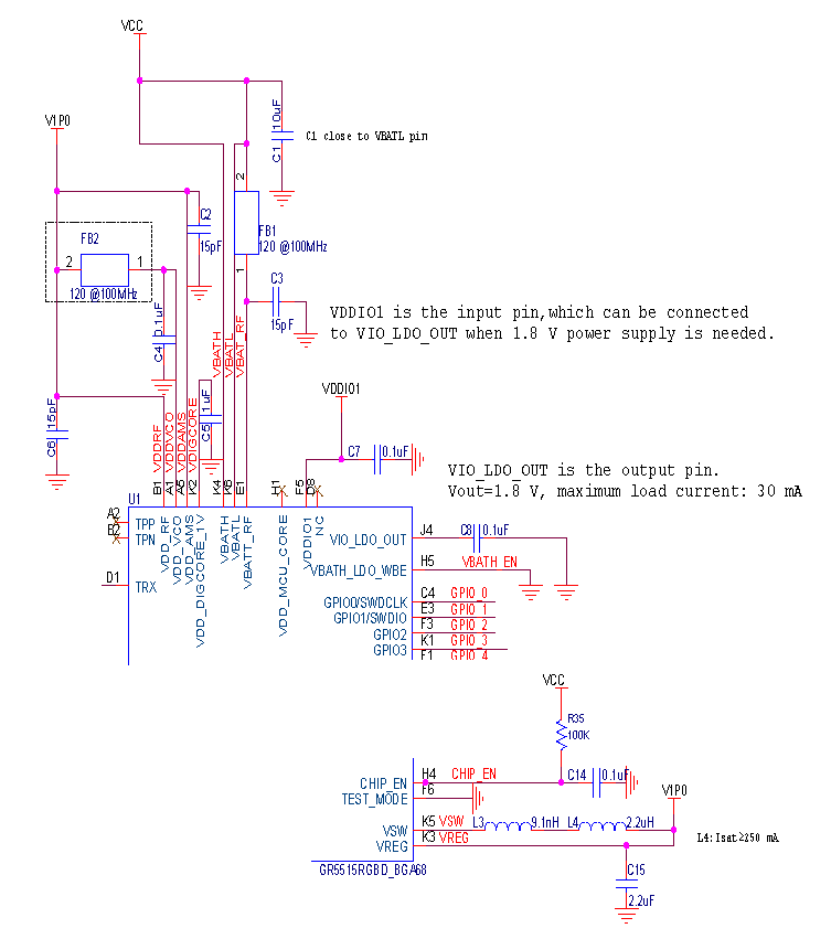 VIO_LDO_OUT在内部和Flash的电源相连,因为Flash工作电压是1.8 V,所以VIO_LDO_OUT默认电压为1.8 V(GR5515I0ND、GR5515I0NDA、GR5513BENDU和GR5515IENDU除外),当VDDIO1和VIO_LDO_OUT外部相连后,芯片整个IO域为1.8 V(MSIO除外)。如需要改变VDDIO1对应的IO电压域,可使用外部电源为VDDIO1引脚供电,供电范围为1.8 V ~ 3.3 V,则VDDIO1对应的GPIOs的电平范围跟随外部输入电压而改变,当外部输入VDDIO1电压时,要注意不能超过电源VBATL的输入电压。
