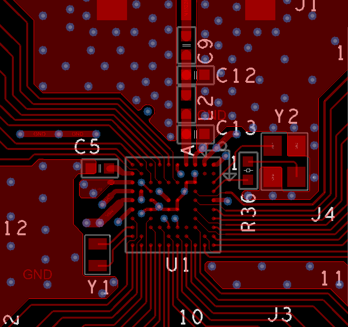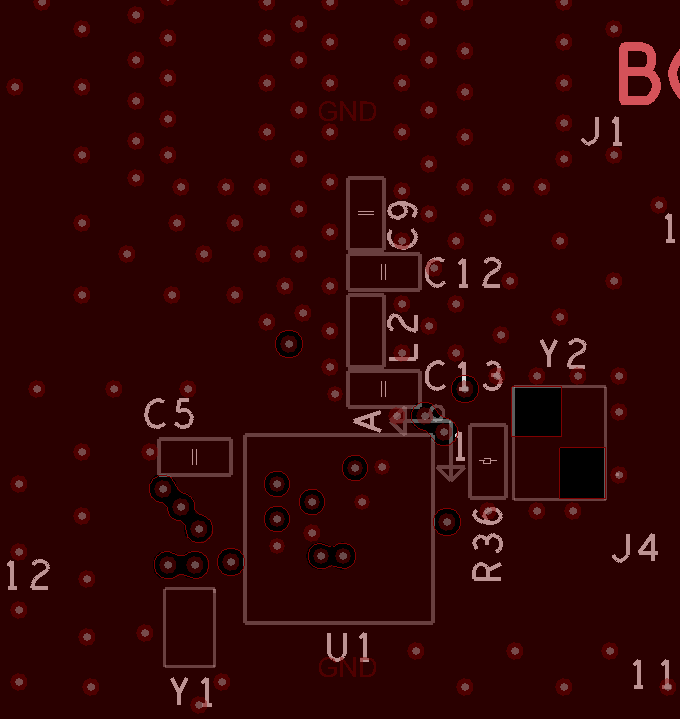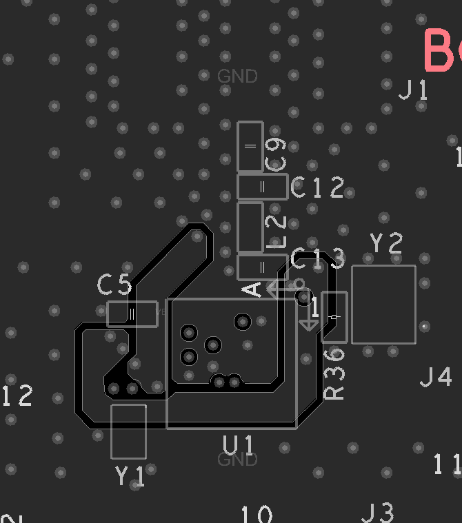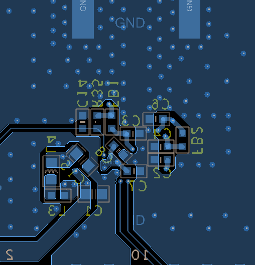 用于接地返回路径和50 Ω射频传输线的参考地平面。为了减小32 MHz晶振的寄生负载电容,在晶振焊盘下方的地平面挖空处理。