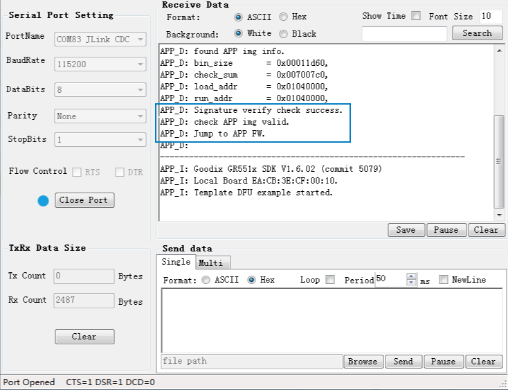 利用GProgrammer将重新编译生成的Second Boot固件second_boot.bin和加签的ble_tem_dfu_fw_sign.bin下载至开发板,并设置Second Boot固件作为Startup固件并运行。Second Boot固件会对ble_tem_dfu_sign.bin固件进行校验和验签,若验证成功,则跳转到该应用固件中运行,如下图所示: