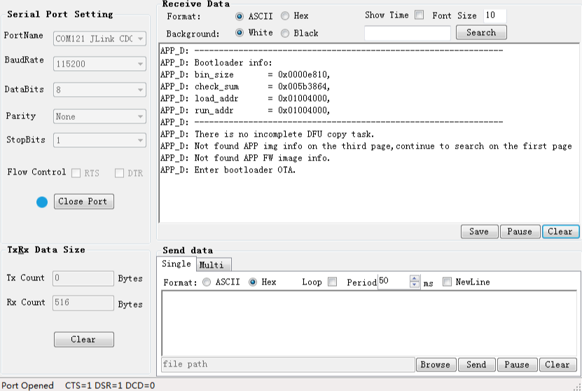 - 将Second Boot固件烧录至开发板后,则进入Second Boot OTA等待固件升级(原理参考交互流程及代码介绍中的步骤3),此时GRUart串口界面如下图所示。