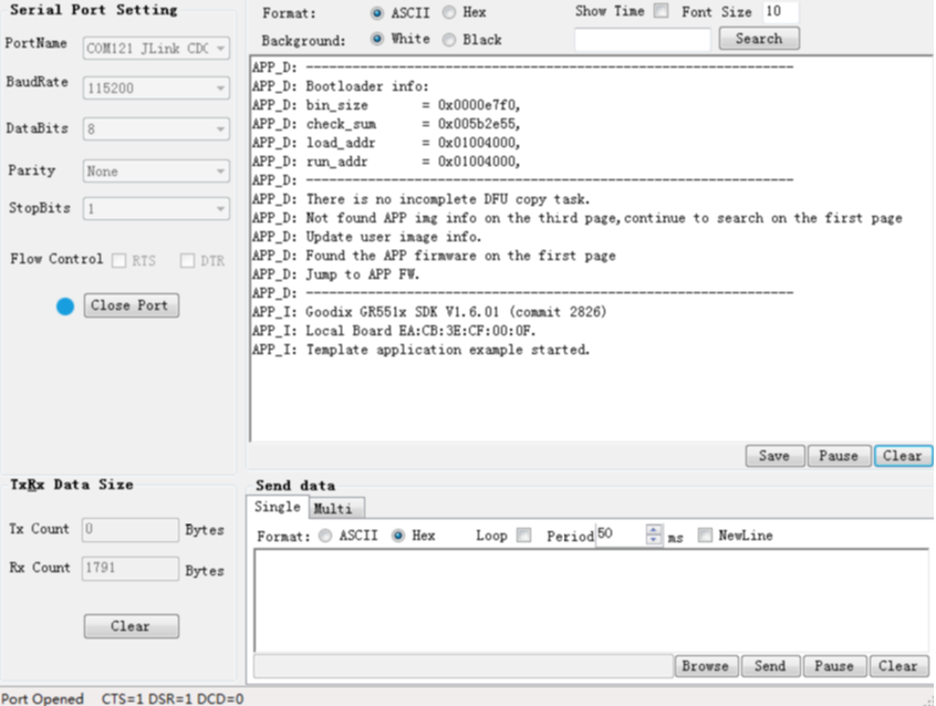 - Second Boot固件中集成了BLE OTA功能,可参考GR551x OTA示例手册在ble_app_template_dfu中进行固件升级章节升级固件,升级完成之后会自动跳转至新的应用固件运行。此时GRUart串口界面如下图所示。